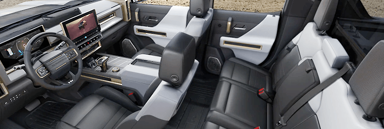 - GMC HUMMER EV’s design cues will be bold and futuristic, featuring carefully executed and clever details such as the distinctive “H” motif seen in a number of elements. The re-imagining of conventional displays communicates the vehicle’s capability and technology via exterior lighting and interior user interfaces.